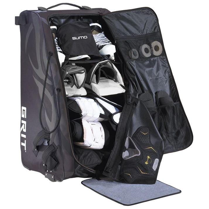 Nová brankářská taška s revolučním systémem ukládání výstroje do jednotlivých přihrádek, to je GRIT GT4 SUMO. Povedený design, kvalitní terenní kolečka a odvětrávací otvory. Povedená taška na lední hokej s děleným prostorem a maximální vzdušností. GRIT GT4 Sumo je hokejová taška pro brankáře, která je vyrobená z robustních a velmi pevných materiálů. Konstrukce tašky je vyztužená a zpevněná rámy, které umožňují držet požadovaný tvar tašky. Hlavní vychytávkou tašek GRIT je špičkově zpracovaný systém odvětrávání, který je umístěn na zadní vyztužené straně. Díky ventilačním otvorůmmůže Vaše výstroj vysychat okamžitě po uložení do dělených přihrádek.