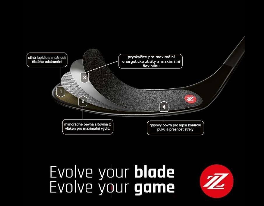 Revoluční páska, disponuje patentovaným několikavrstvým materiálem,který pomáhá zlepšit přesnost střely, ovládání puku a přináší delší výdrž.